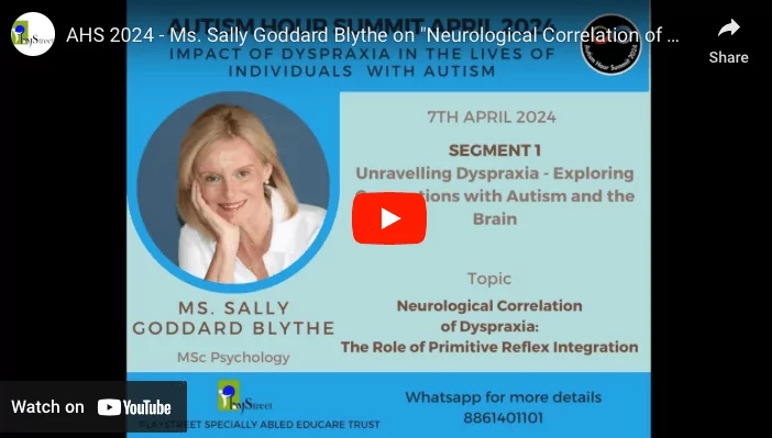 Watch Sally Goddard Blythe at the Autism Hour Summit 2024 with PlayStreet in her in-depth conversation on “Neurological Correlation of Dyspraxia: The Role of Primitive Reflex Integration”. Click here or on the image to watch (YouTube). To see the video on Facebook use this link.